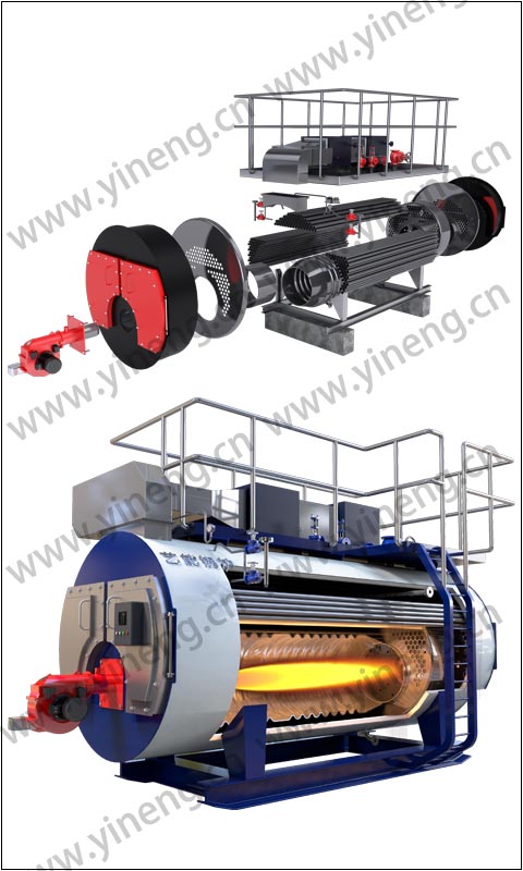 1.采用濕背式內(nèi)燃兩回程結(jié)構(gòu),鍋爐頂部帶有頂盤管,有效的防止了火焰直接輻射后墻,同時在緊湊的結(jié)構(gòu)前提下,增加了輻射受熱面積,提高了鍋爐的熱效率。